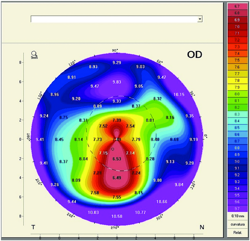 - Corneal Topography and tomography: Creates a detailed map of the cornea’s surface curvature, identifying any irregularities indicative of keratoconus. Which also helps in monitoring the disease progression.